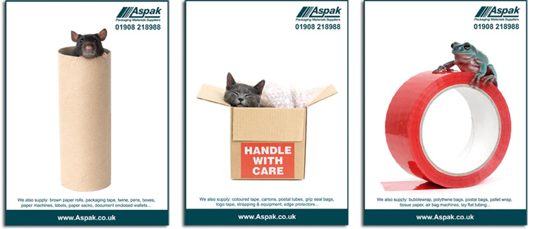 Direct mail postcards for Aspak Packaging, Enfield, Middlesex.